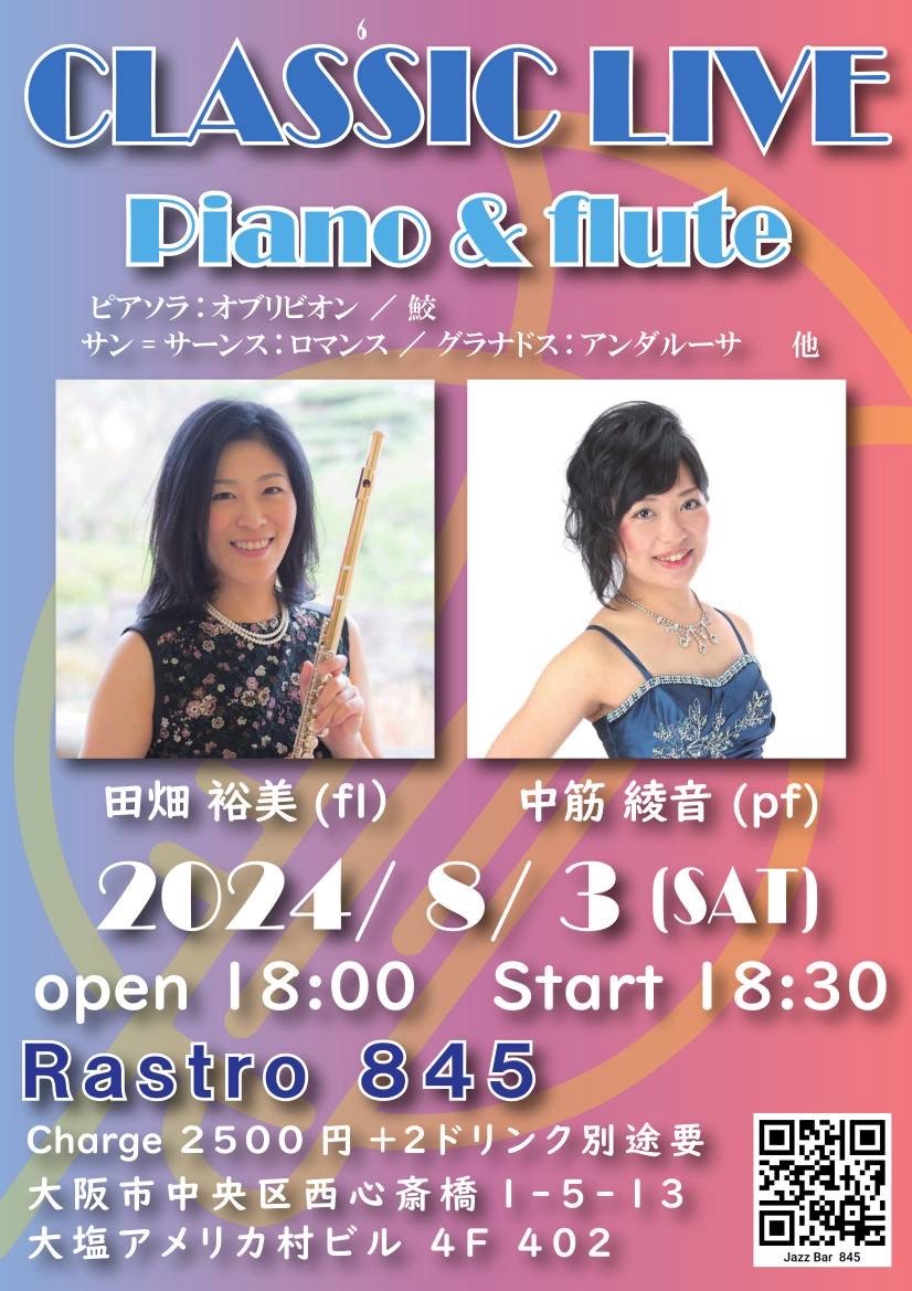 (夜) Classic Live 8月 3 Sat 2024 心斎橋 / Rastro845 メンバー 田畑裕美(fl) 中筋綾音 (p) チャージ¥2500+2オーダー別途要 前のスケジュール 次のスケジュール