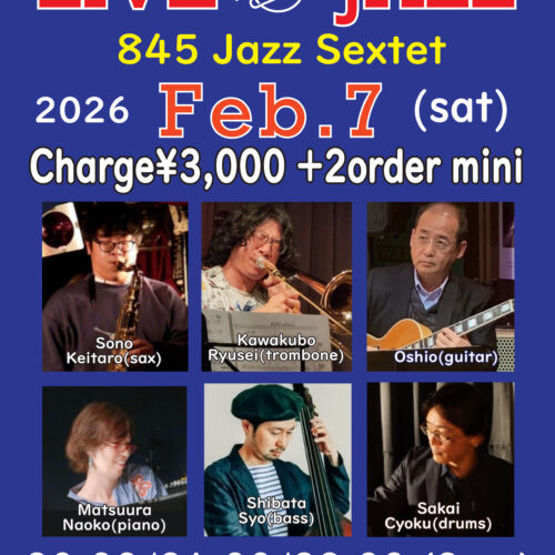 (夜) Jazz Live 2月 7 Sat 2026 難波 / Bigsalt845 メンバー 園恵太郎(sax)、川久保琉聖(tb)、松浦尚子(p) Oshio(g)、芝田奨(b)、阪井ちょく(ds) チャージ¥3000+2オーダー別途要 前のスケジュール 次のスケジュール