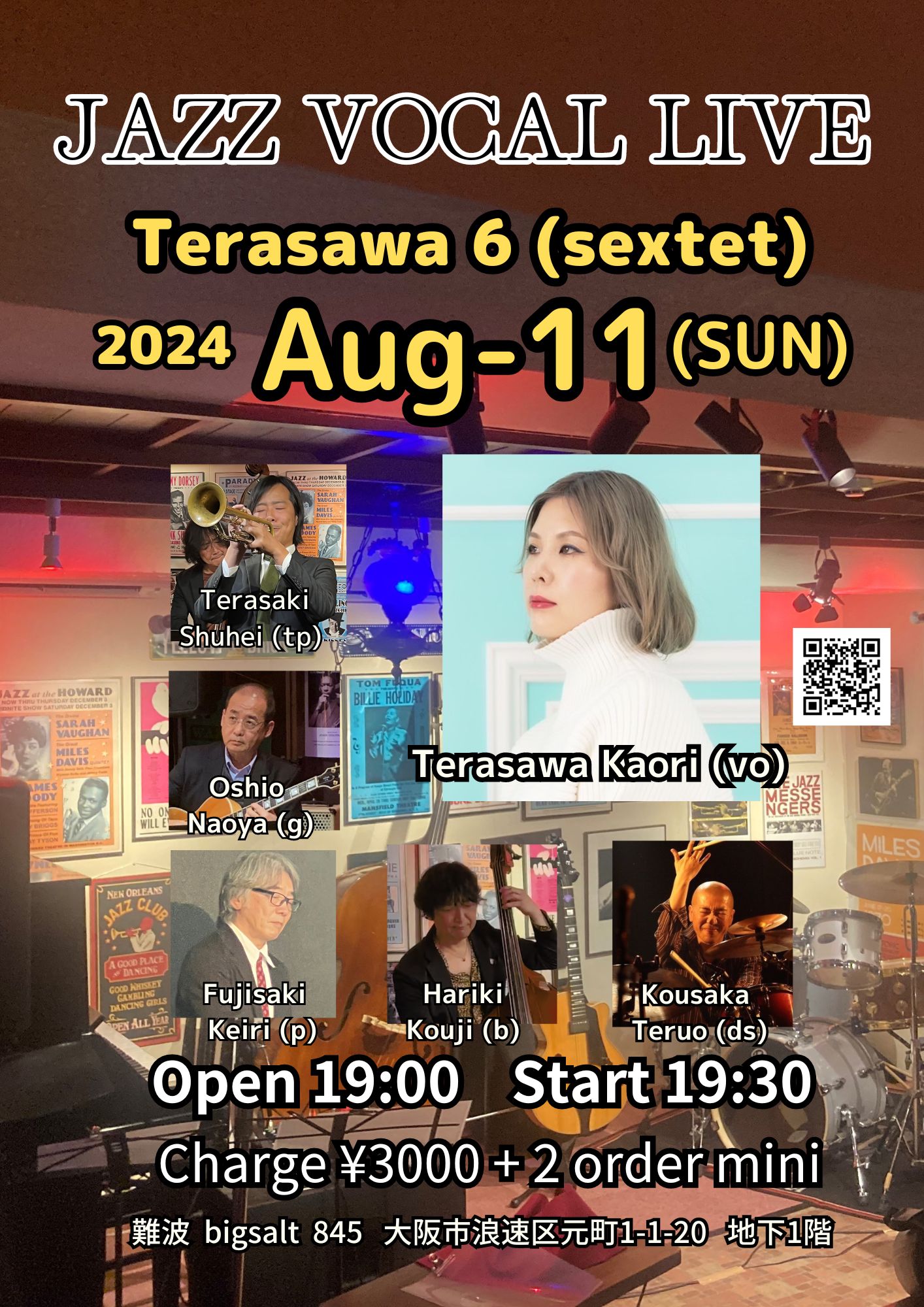 (夜) Jazz Vocal Live 8月 11 Sun 2024 難波 / Bigsalt845 メンバー 寺澤香織 (vo), 寺崎周平(tp) 大塩直哉(g), 藤嵜佳里(p) 張木浩司 (b)、コウサカテルオ(ds) チャージ¥3000+2オーダー別途要 前のスケジュール 次のスケジュール