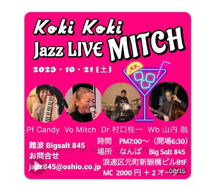 (夜) Jazz Vocal Live 10月 21 Sat 2023 難波 / Bigsalt845 メンバー Mitch (vo) canday momoko (p) 山内融(b) 村口桂一(ds) チャージ¥2000+2オーダー別途要 前のスケジュール 次のスケジュール