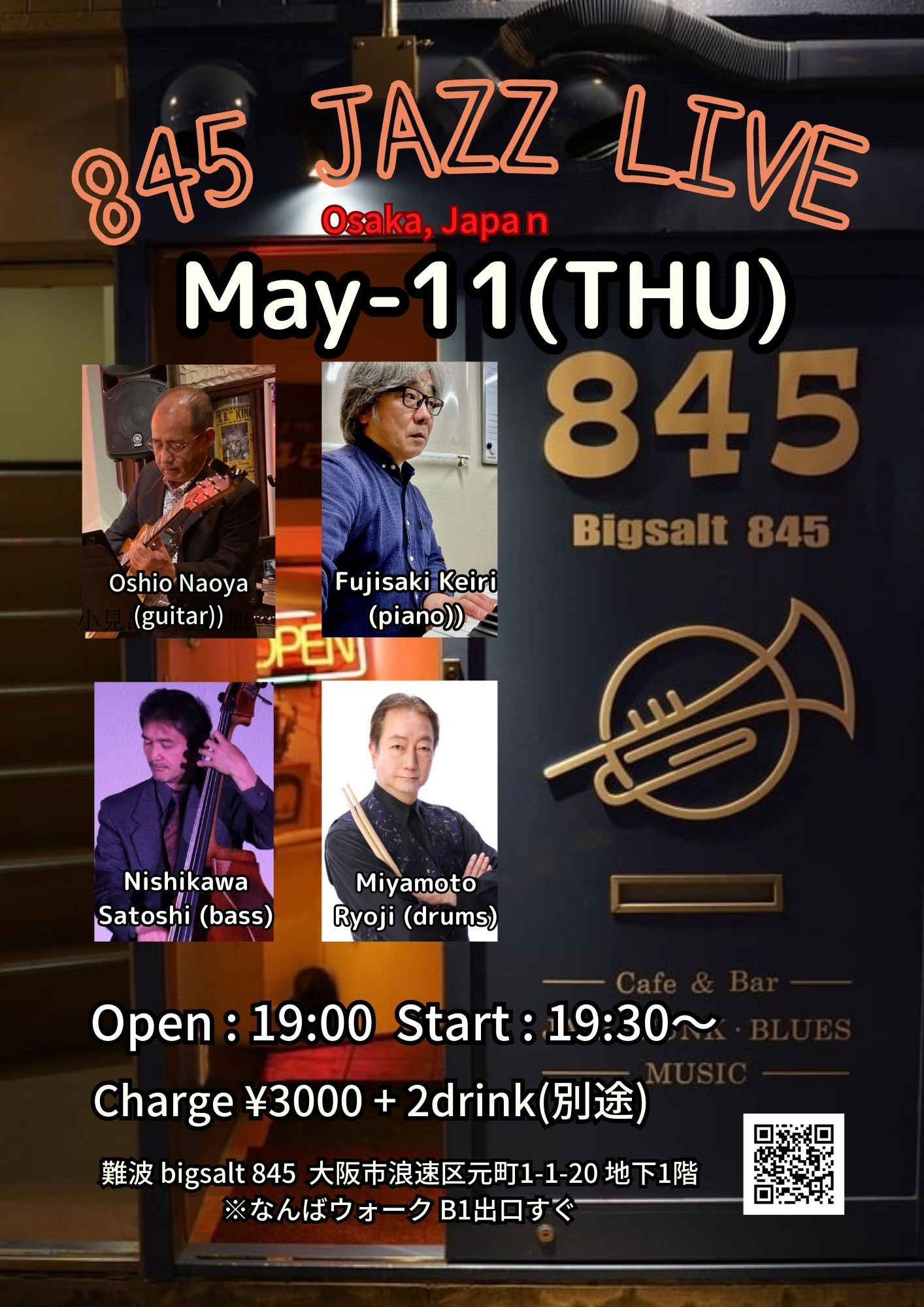 845 Jazz Quarted 大塩直哉(g)+藤嵜佳理(p)+西川サトシ(b)+宮本リョージ(ds) 5月 11 Thu 2023 難波 / Bigsalt845 メンバー 大塩直哉(g) 藤嵜佳理(p) 西川サトシ(b) 宮本リョージ(ds) チャージ¥3000+ドリンク別(1杯以上注文) 前のスケジュール 次のスケジュール