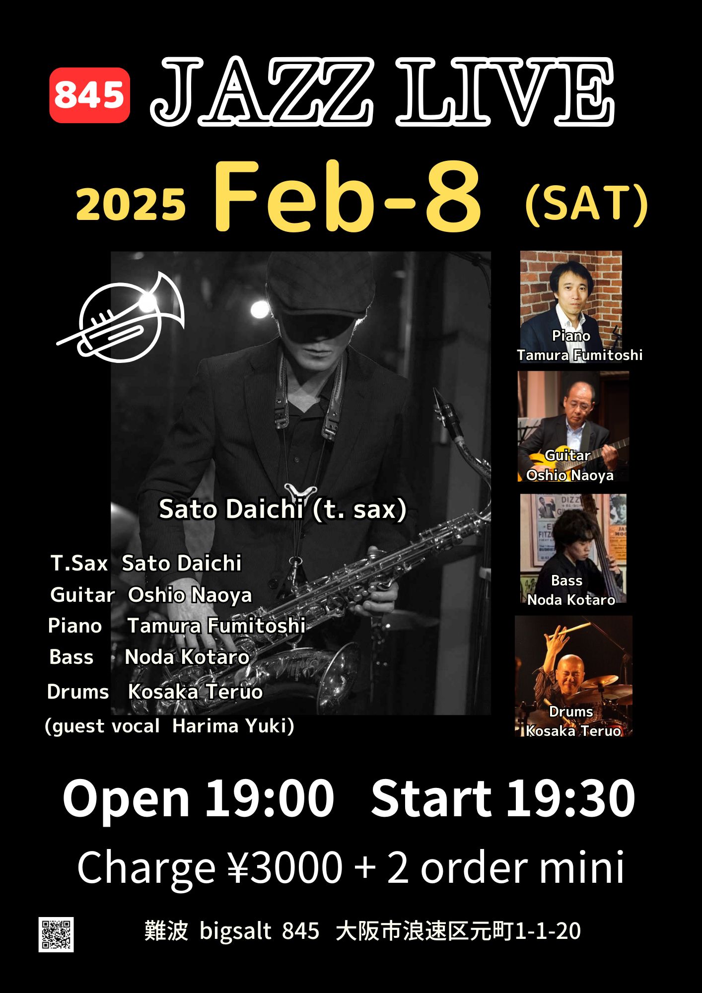 (夜)Jazz Live 2月 8 Sat 2025 難波 / Bigsalt845 メンバー 佐藤大地 (sax) 大塩直哉(g) 田村文利 (p) 野田小太郎 (b) コウサカテルオ (ds) チャージ¥3000+2オーダー別途要 前のスケジュール 次のスケジュール