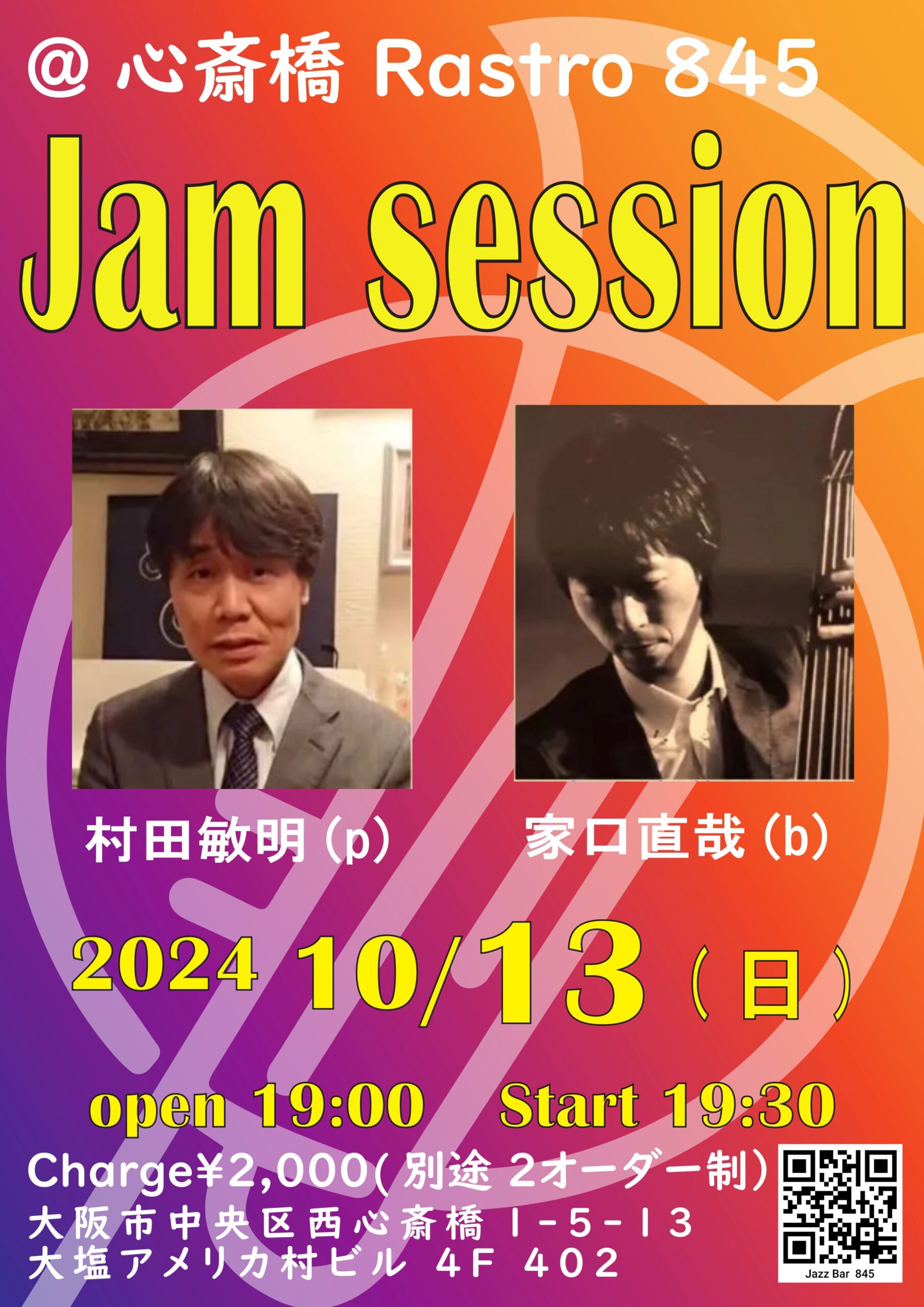 (夜) Jam Session 10月 13 Sun 2024 心斎橋 / Rastro845 メンバー 村田敏明 (p) 家口直哉 (b) チャージ¥2000+2オーダー別途要 前のスケジュール 次のスケジュール