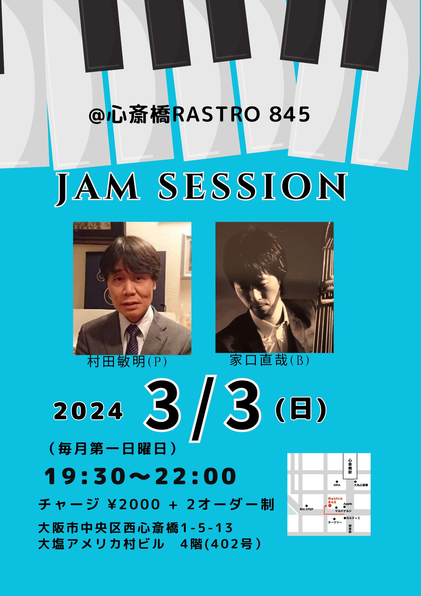 (夜) Jam Session 3月 3 Sun 2024 心斎橋 / Rastro845 メンバー 村田敏明(p) 家口直哉(b) チャージ¥2000+2オーダー別途要 前のスケジュール 次のスケジュール