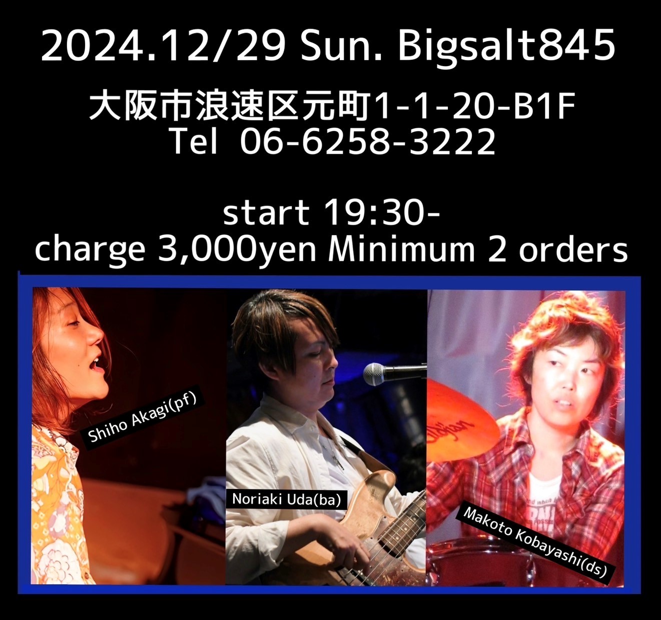 (夜) Jazz Live 12月 29 Sun 2024 難波 / Bigsalt845 メンバー あかぎしほ (p) うだ のりあき (eb) 小林真琴 (ds) チャージ¥3000+2オーダー別途要 前のスケジュール 次のスケジュール
