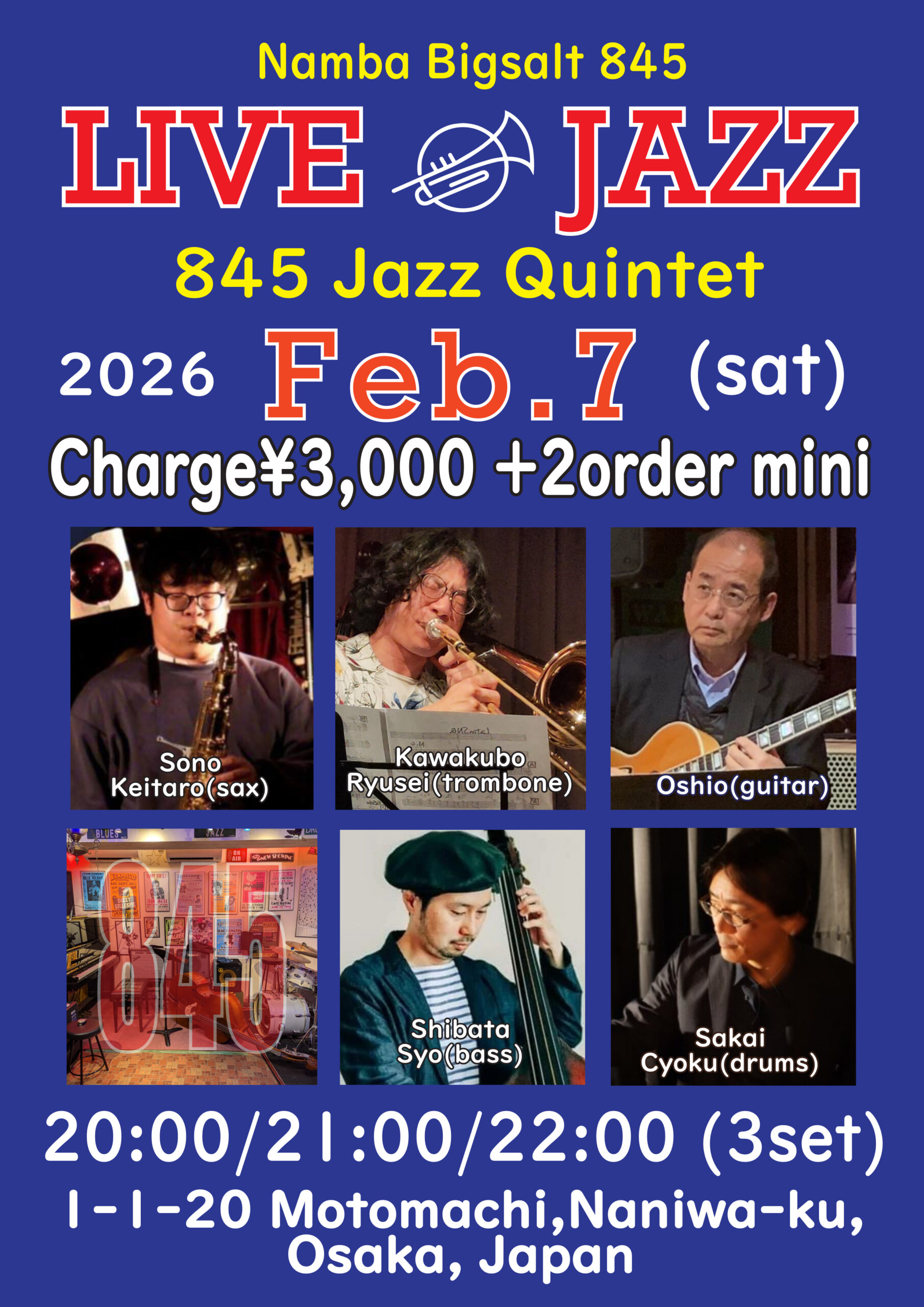(夜) Jazz Live 2月 7 Sat 2026 難波 / Bigsalt845 メンバー 園恵太郎(sax)、川久保琉聖(tb)、松浦尚子(p) Oshio(g)、芝田奨(b)、阪井ちょく(ds) チャージ¥3000+2オーダー別途要 前のスケジュール 次のスケジュール