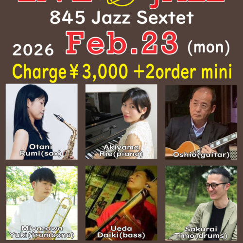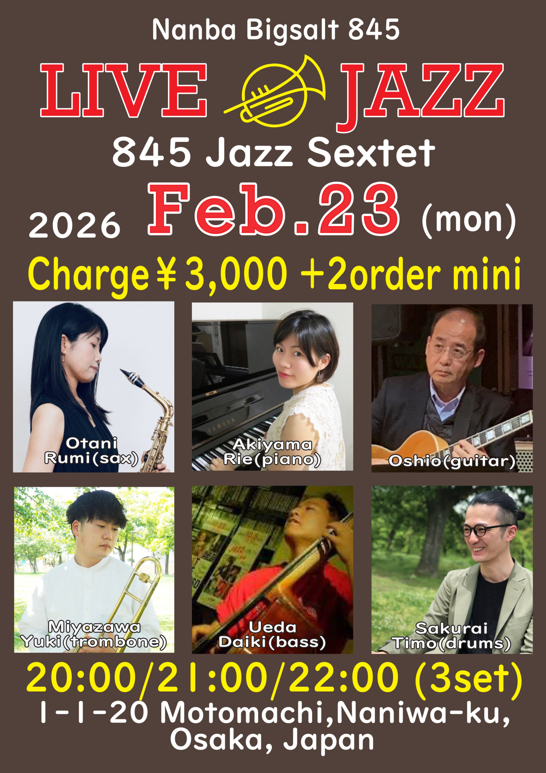 (夜) Jazz Live 2月 23 Mon 2026 難波 / Bigsalt845 メンバー 大谷瑠美(sax)、秋山莉恵(p)、宮澤勇樹(tb) Oshio(g)、上田大喜(b)、櫻井ティモ(ds) チャージ¥3000+2オーダー別途要 前のスケジュール 次のスケジュール