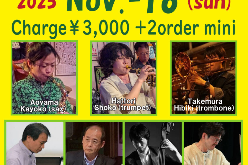 (夜) Jazz Septet Live (第3日曜夜) 11月 16 Sun 2025 難波 / Bigsalt845 メンバー 服部祥子(tp)、青山加世子(sax)、竹村響(tb)、田村文利(p) Oshio(g)、家口直哉(b)、奥瀬健介(ds) チャージ¥3000 + 2オーダー別途要 前のスケジュール 次のスケジュール