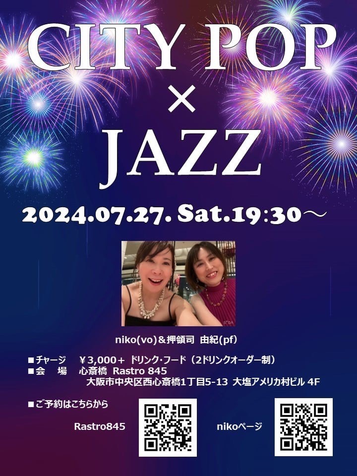 (夜) Jazz Vocal Live 7月 27 Sat 2024 心斎橋 / Rastro845 メンバー niko (vo) 押領司由紀 (p) チャージ¥3000+2オーダー別途要 前のスケジュール 次のスケジュール