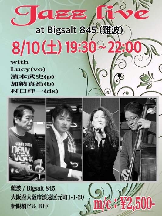 (夜) Jazz Vocal Live 8月 10 Sat 2024 難波 / Bigsalt845 メンバー Lucy (vo) 濱本武史 (p) 加納真治 (b) 村口桂一 (ds) チャージ¥2500+2オーダー別途要 前のスケジュール 次のスケジュール