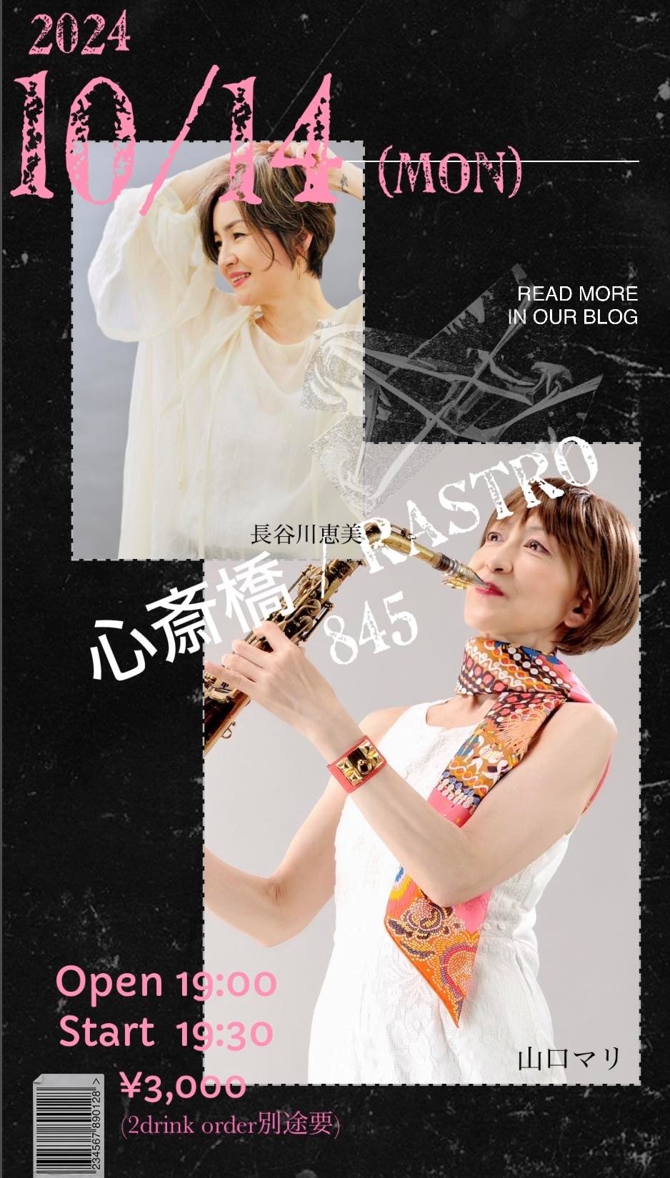 (夜) Jazz Vocal Live 10月 14 Mon 2024 心斎橋 / Rastro845 メンバー 長谷川恵美(p, vo) 山口マリ(sax) チャージ¥3000+2オーダー別途要 前のスケジュール 次のスケジュール