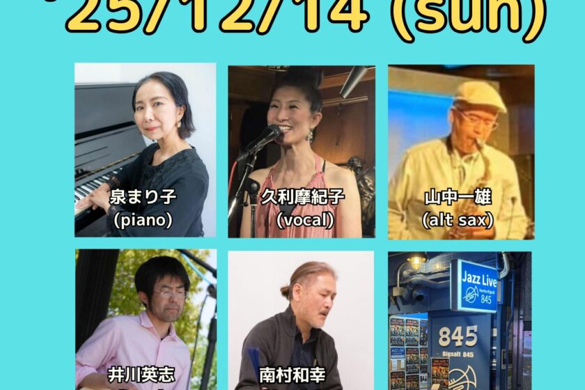 (昼) Jazz Live 12月 14 Sun 2025 難波 / Bigsalt845 メンバー 泉まり子(p)、久利摩紀子(vo)、山中一雄(sax)、井川英志(b)、南村和幸(ds) チャージ¥2500+2オーダー別途要 前のスケジュール 次のスケジュール