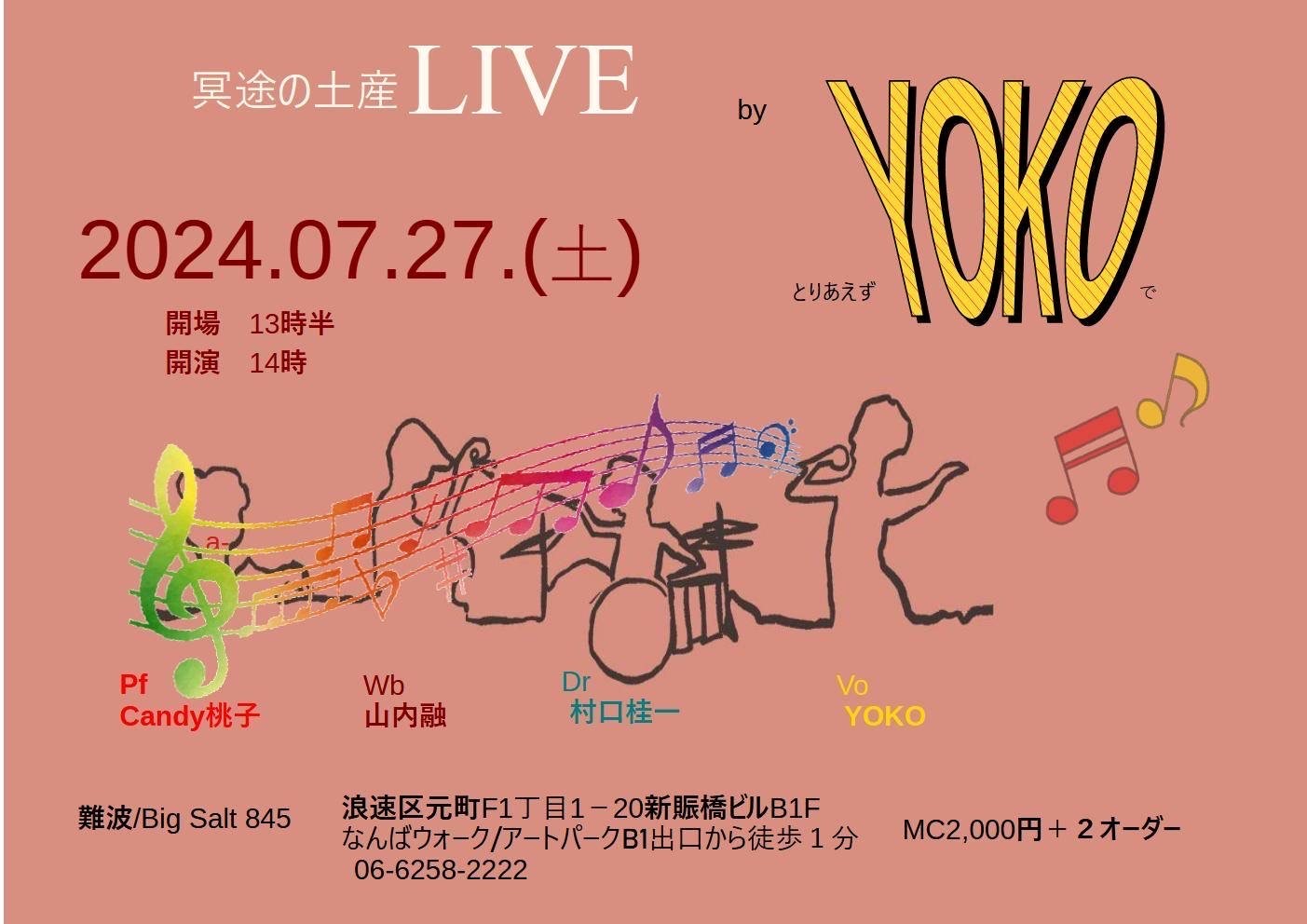 (昼) Jazz Vocal Live 7月 27 Sat 2024 難波 / Bigsalt845 メンバー 木村ようこ (vo) Candy桃子 (p) 山内融 (b) 村口桂一 (ds) チャージ¥2000+2オーダー別途要 前のスケジュール 次のスケジュール