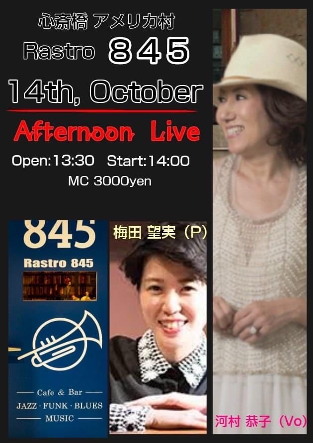 (昼) Jazz Vocal Live 10月 14 Mon 2024 心斎橋 / Rastro845 メンバー 河村恭子 (vo) 梅田望実 (p) チャージ¥3000+2オーダー別途要 前のスケジュール 次のスケジュール