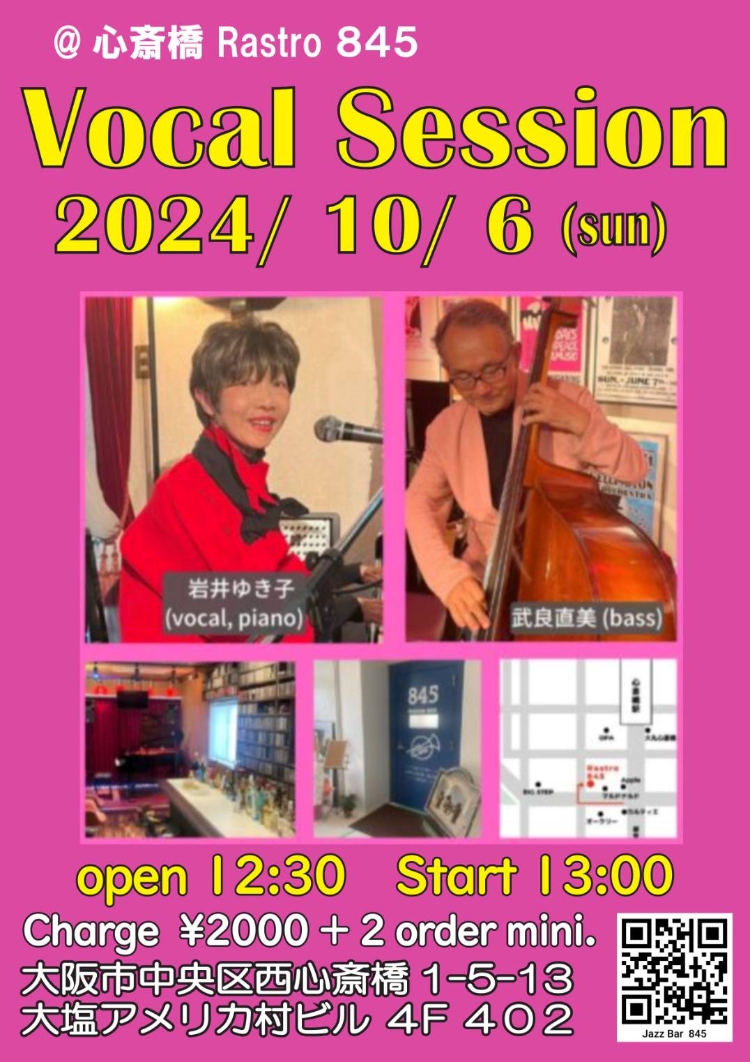 (昼) Vocal Session 10月 6 Sun 2024 心斎橋 / Rastro845 メンバー 岩井ゆき子 (p, vo) 武良直美 (b) チャージ¥2000+2オーダー別途要 前のスケジュール 次のスケジュール