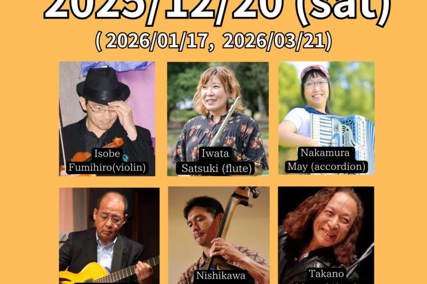 (毎第3土曜夜) Violin, Flute & Accordion Jazz Live 12月 20 Sat 2025 難波 / Bigsalt845 メンバー 磯部史浩(vn)、岩田さつき(fl)、中村メイ(acc) Oshio(g)、西川サトシ(b)、高野正明(par) チャージ¥3000+2オーダー別途要 前のスケジュール 次のスケジュール