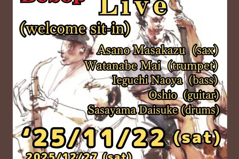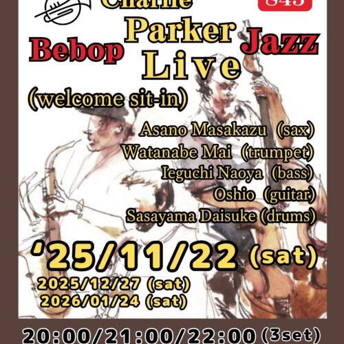 (毎第4土曜夜) “Paeker”Be-bop Jazz Live (wlcom sit-in) 11月 22 Sat 2025 難波 / Bigsalt845 メンバー 浅野まさかず(sax)、渡邉麻衣(tp)、Oshio(g)、家口直哉(b)、笹山大輔(ds) チャージ¥3000 + 2オーダー別途要 前のスケジュール 次のスケジュール