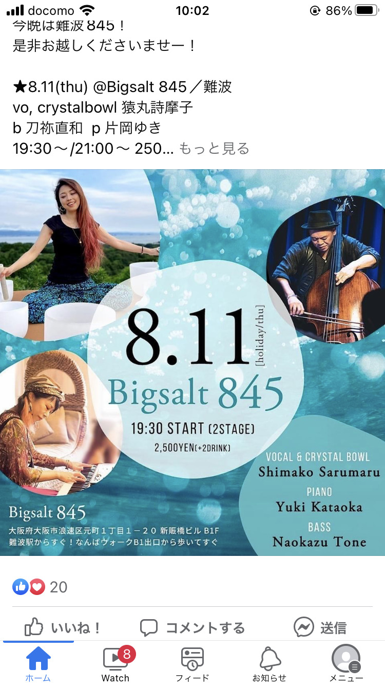 猿丸詩摩子(vo, crystal bowl) + 片岡ゆき(pf) + 刀祢直和(cb) 8月 11 Thu 2022 難波 / Bigsalt845 メンバー 猿丸詩摩子(vo, crystal bowl) 片岡ゆき(pf) 刀祢直和(cb) チャージ¥2500+ドリンク別(2杯以上注文) 前のスケジュール 次のスケジュール