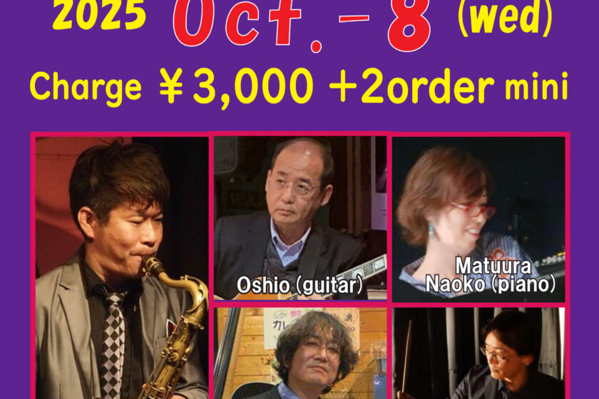 Jazz Live 10月 8 Wed 2025 難波 / Bigsalt845 メンバー 里村稔(sax)、松浦尚子(p)、Oshio(g)(b) 張木浩司(b)、阪井ちょく(ds) チャージ¥3000+2オーダー別途要 前のスケジュール 次のスケジュール