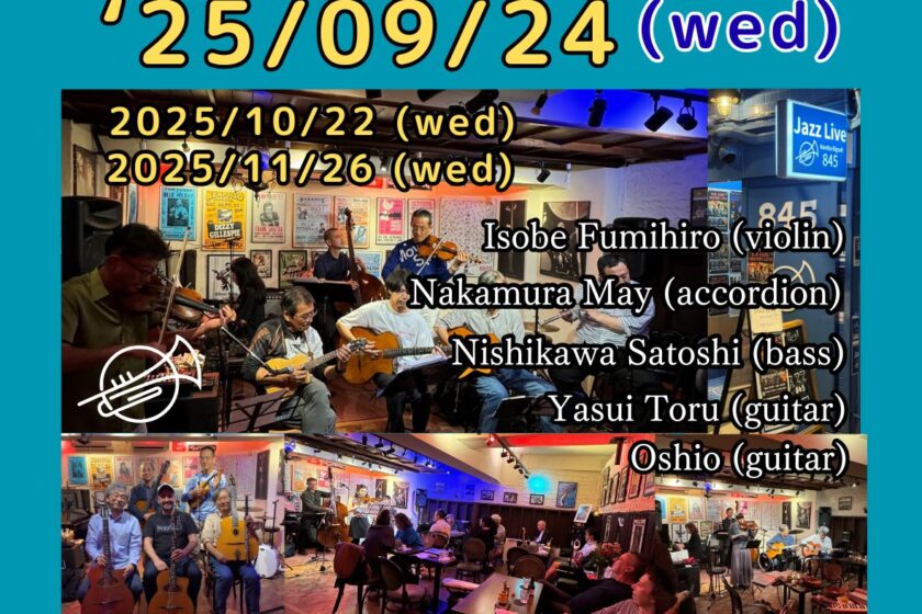 845 Gypsy Hot Jazz Live (welcom sit-in) 9月 24 Wed 2025 難波 / Bigsalt845 メンバー 西川サトシ (b),磯部史浩(vn),中村メイ(acc)安井亨(g),大塩直哉(g) チャージ¥2500+2オーダー別途要 前のスケジュール 次のスケジュール