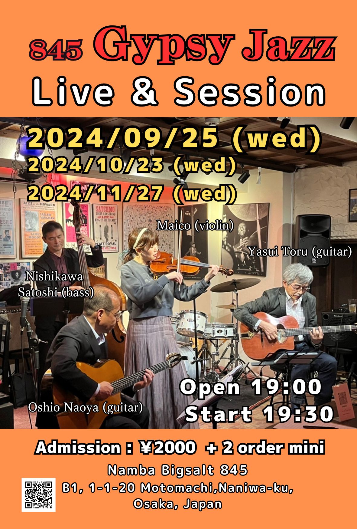 845 Gypsy Jazz Session 9月 25 Wed 2024 難波 / Bigsalt845 メンバー 西川サトシ (b) Maico(vn) 安井亨 (g) 大塩直哉 (g) チャージ¥2000+2オーダー別途要 前のスケジュール 次のスケジュール