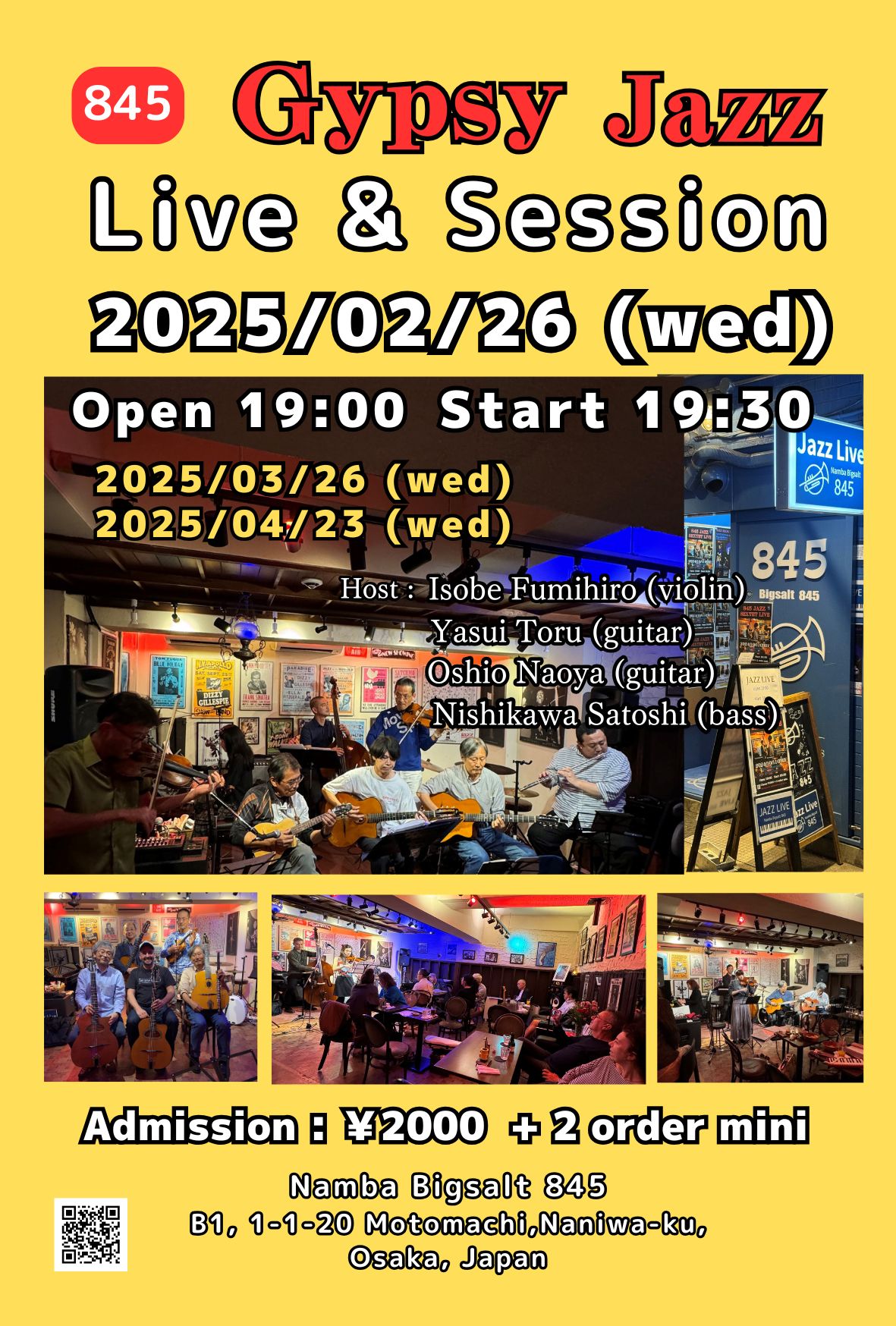 845 Gypsy Jazz Session & Live (毎第4水曜) 2月 26 Wed 2025 難波 / Bigsalt845 メンバー 西川サトシ (b)、磯部史浩(vn) 安井亨(g), 大塩直哉(g) チャージ¥2000+2オーダー別途要 前のスケジュール 次のスケジュール
