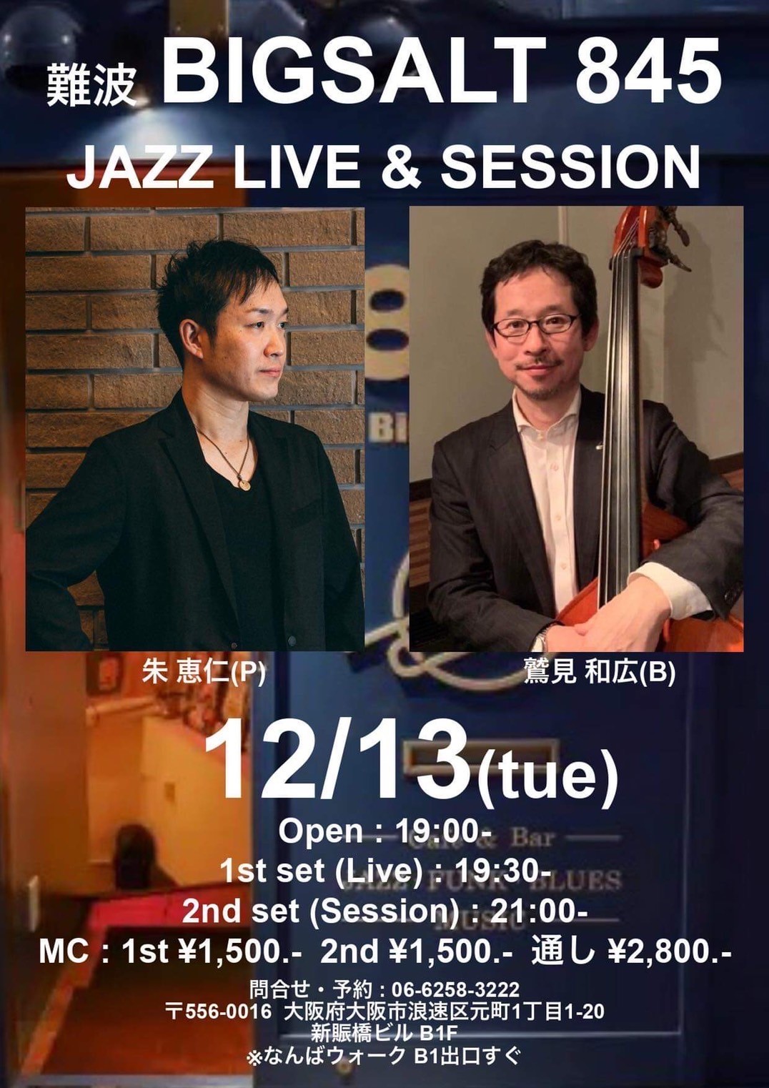 845 Live(1st set) & Session(2nd set) 鷲見和弘(b) + 朱恵仁(p) 12月 13 Tue 2022 難波 / Bigsalt845 メンバー 鷲見和弘(b) 朱恵仁(p) チャージ¥1500(1st set), ¥1500(2nd set), 通し¥2800+ドリンク別(2杯以上注文) 前のスケジュール 次のスケジュール