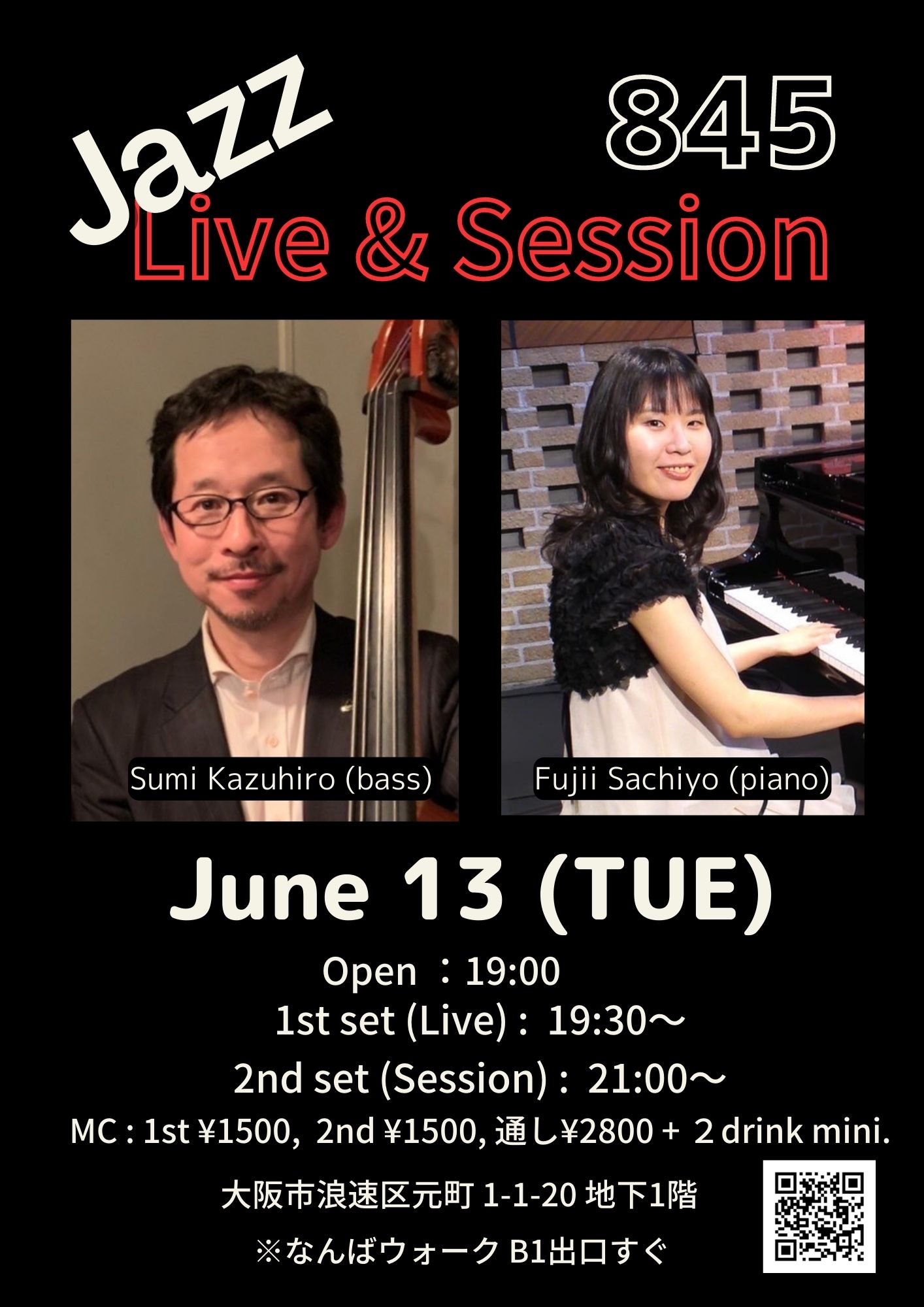 845 Live & Session 鷲見和広(b)+藤井さちよ(p) 6月 13 Tue 2023 難波 / Bigsalt845 メンバー 鷲見和広(b) 藤井さちよ(p) チャージ¥1500(1st set), ¥1500(2nd set), 通し¥2800+ドリンク別(2杯以上注文) 前のスケジュール 次のスケジュール