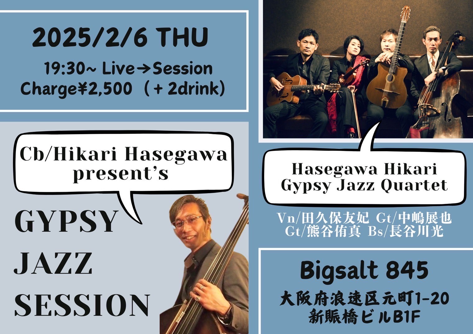 Gypsy Jazz Live & Session 2月 6 Thu 2025 難波 / Bigsalt845 メンバー 長谷川光(b),田久保友妃(vn), 中嶋展也(g), 熊谷侑真(g) チャージ¥2500+2オーダー別途要 前のスケジュール 次のスケジュール