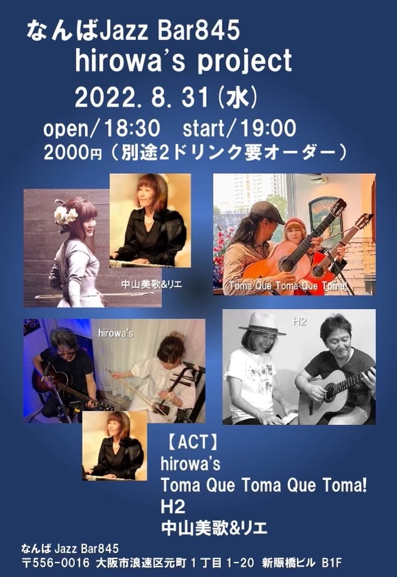 hirowa’dzu project 8月 31 Wed 2022 難波 / Bigsalt845 メンバー hirowa's Toma Que Toma Que Toma! H2 中山美歌&リエ チャージ¥2000+ドリンク別(2杯以上注文) 前のスケジュール 次のスケジュール