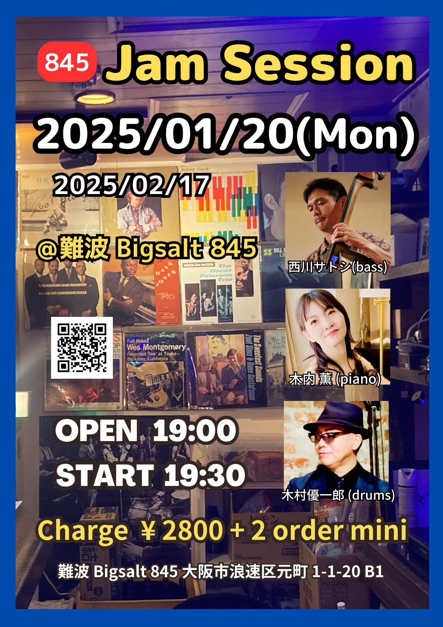 Jam Session 1月 20 Mon 2025 難波 / Bigsalt845 メンバー 西川サトシ (b) 木内薫 (p) 木村優一郎 (ds) チャージ¥2800+2オーダー別途要 前のスケジュール 次のスケジュール