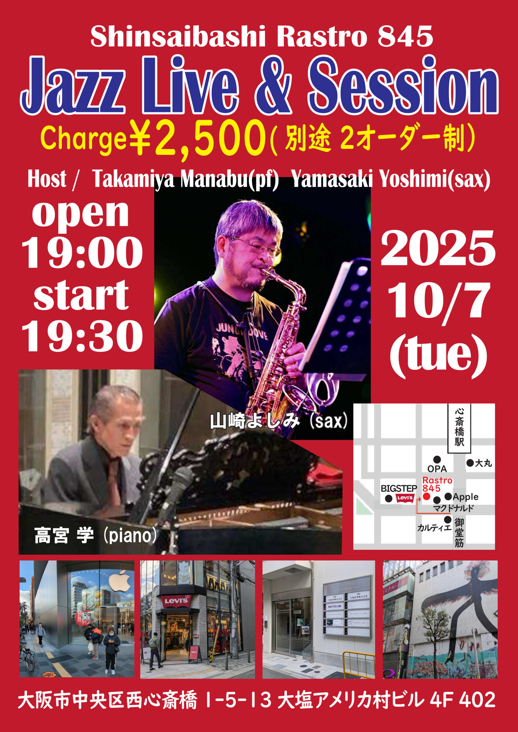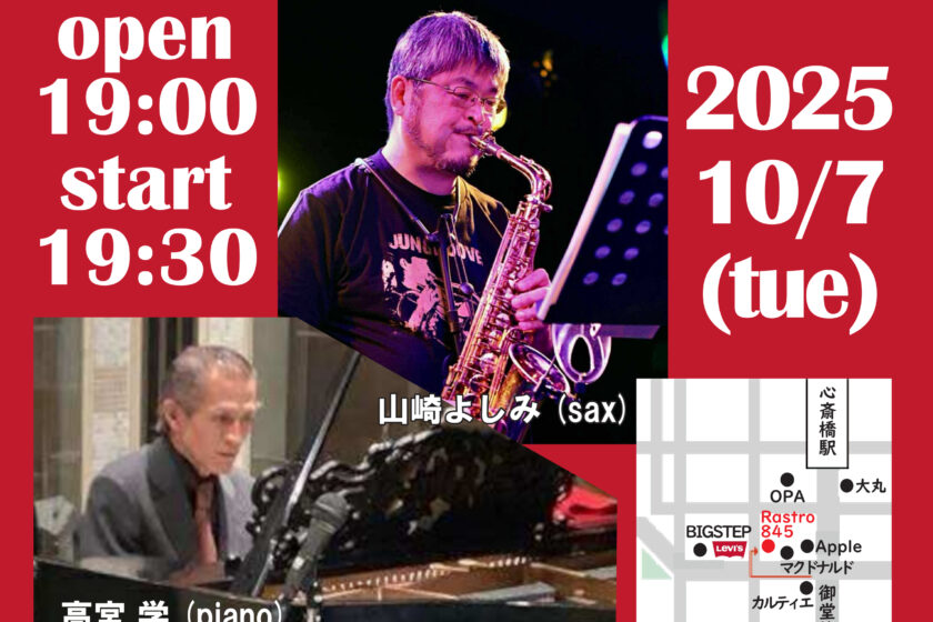Jam Session 10月 7 Tue 2025 心斎橋 / Rastro845 メンバー 高宮学(p)、山﨑よしみ(sax) チャージ¥2500+2オーダー別途要 前のスケジュール 次のスケジュール