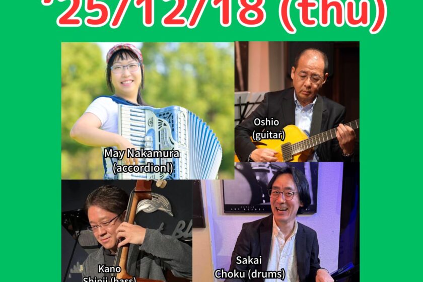 Jazz Accordion Live 12月 18 Thu 2025 難波 / Bigsalt845 メンバー 中村メイ(acc)、Oshio(g)、加納真治(b)、阪井ちょく(ds) チャージ¥3000+2オーダー別途要 前のスケジュール 次のスケジュール