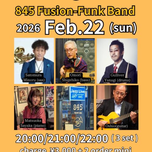 Live Jazz 845 Fusion-Funk band 2月 22 Sun 2026 難波 / Bigsalt845 メンバー 大森成彦(eb)、里村稔(sax)、松岡佐也可(key) Oshio(g)、ガリバー柳(ds) チャージ¥3000+2オーダー別途要 前のスケジュール 次のスケジュール