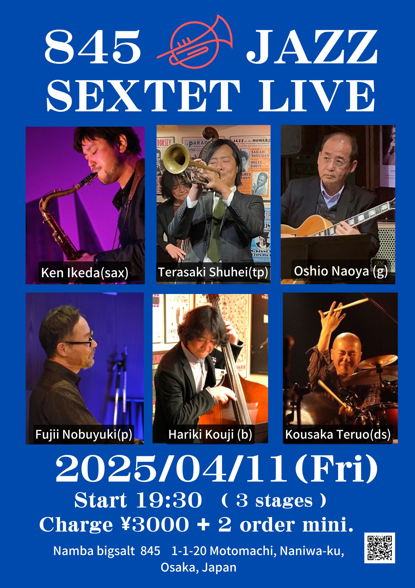 Jazz Live 845 Jazz Sextet (毎月出演) 4月 11 Fri 2025 難波 / Bigsalt845 メンバー 寺崎周平 (tp), 池田ケン (sax) 藤井信之(p), 大塩直哉(g), 藤井信之(p), コウサカテルオ(ds) チャージ¥3000 + 2オーダー別途要 前のスケジュール 次のスケジュール
