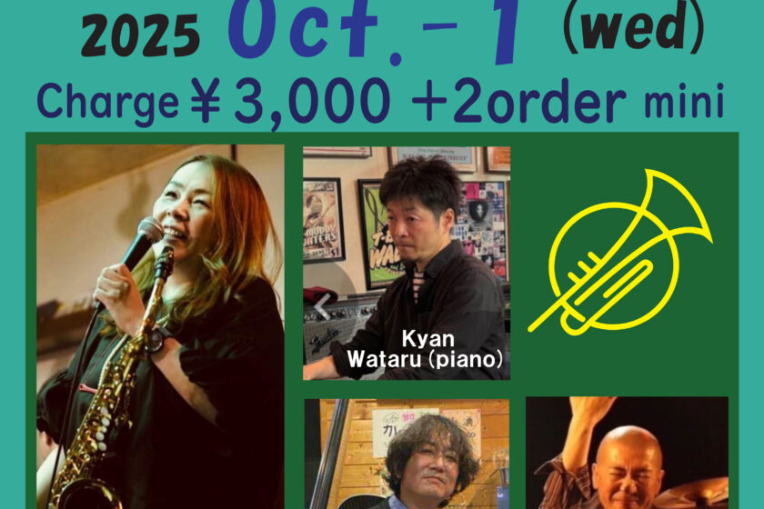 Jazz Live (毎第1水曜) 10月 1 Wed 2025 難波 / Bigsalt845 メンバー 水谷浩子(sax&vo)、喜屋武弥(p) 張木浩司(b)、コウサカテルオ(ds) チャージ¥3000+2オーダー別途要 前のスケジュール 次のスケジュール