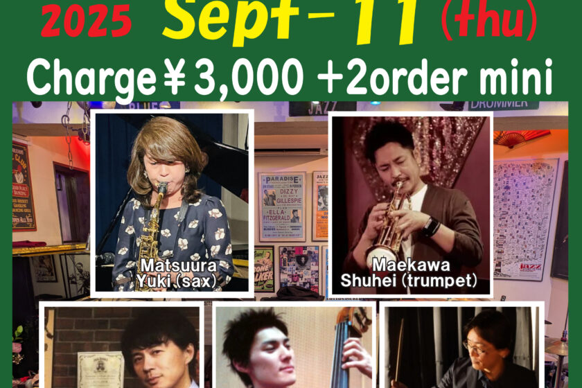 Jazz Live 9月 11 Thu 2025 難波 / Bigsalt845 メンバー 松浦由紀(sax)、前川修平(tp)、木下孝朗(p) 泉正浩(b)、阪井ちょく(ds) チャージ¥3000+2オーダー別途要 前のスケジュール 次のスケジュール