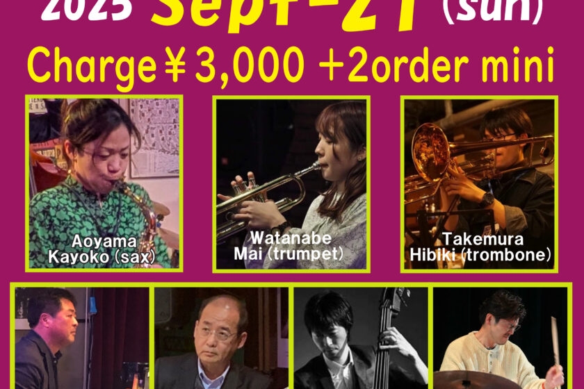 Jazz Live 9月 21 Sun 2025 難波 / Bigsalt845 メンバー 渡邉麻衣(tp)、青山加世子(sax)、竹村響(tb)、濱本武史(p) Oshio(g)、家口直哉(b)、奥瀬健介(ds) チャージ¥3000+2オーダー別途要 前のスケジュール 次のスケジュール