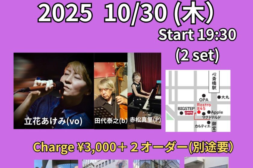 Jazz Live 10月 30 Thu 2025 心斎橋 / Rastro845 メンバー 立花あけみ(vo)、赤松真理(p)、田代泰之(b) チャージ¥3000+2オーダー別途要 前のスケジュール 次のスケジュール