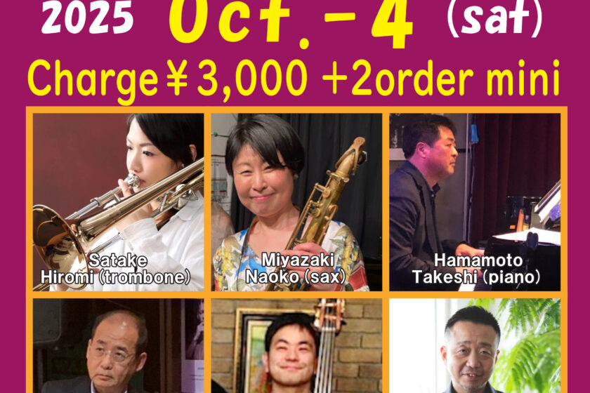Jazz Live 10月 4 Sat 2025 難波 / Bigsalt845 メンバー 佐竹寛美(tb)、宮崎直子(sax)、濱本武史(p) Oshio(g)、岡井雄一郎(b)、小森まさと(ds) チャージ¥3000+2オーダー別途要 前のスケジュール 次のスケジュール