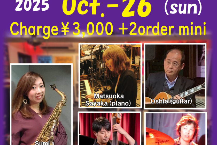Jazz Live 10月 26 Sun 2025 難波 / Bigsalt845 メンバー 角裕子(sax)、松岡佐也可(p)、Oshio(g) 西尾寛之(b)、小林真琴(ds) チャージ¥3000+2オーダー別途要 前のスケジュール 次のスケジュール