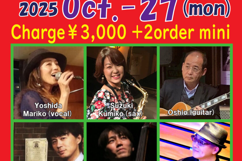 Jazz Live 10月 27 Mon 2025 難波 / Bigsalt845 メンバー 吉田真里子(vo)、鈴木久美子(sax)、木下孝朗(p) Oshio(g)、近藤哲生(b)、木村優一郎(ds) チャージ¥3000+2オーダー別途要 前のスケジュール 次のスケジュール