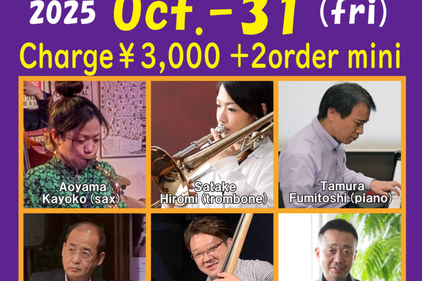 Jazz Live 10月 31 Fri 2025 難波 / Bigsalt845 メンバー 青山加世子(sax)、 佐竹寛美(tb)、田村文利(p) Oshio(g)、加納真治(b)、小森まさと(ds) チャージ¥3000+2オーダー別途要 前のスケジュール 次のスケジュール