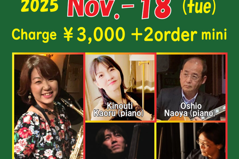 Jazz Live 11月 18 Tue 2025 難波 / Bigsalt845 メンバー 鈴木久美子(sax)、木内薫(p)、Oshio(g)、近藤哲生(b)、阪井ちょく(ds) チャージ¥3000 + 2オーダー別途要 前のスケジュール 次のスケジュール