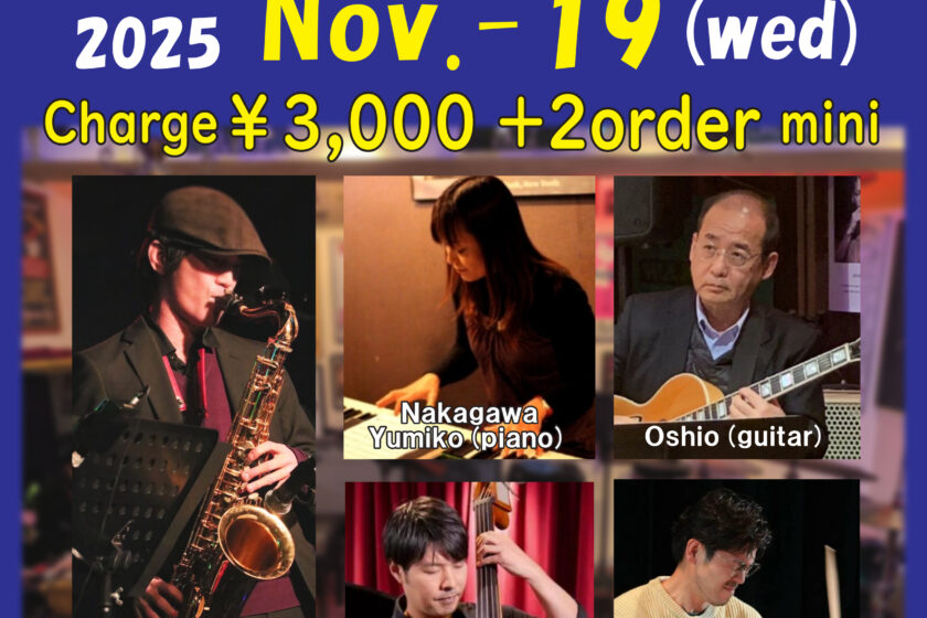 Jazz Live 11月 19 Wed 2025 難波 / Bigsalt845 メンバー 佐藤大地 (sax)、中川由美子(p)、Oshio(g) 西尾寛之(b)、奥瀬健介(ds) チャージ¥3000 + 2オーダー別途要 前のスケジュール 次のスケジュール