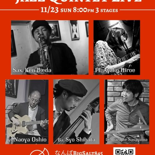 Jazz Live 11月 23 Sun 2025 難波 / Bigsalt845 メンバー 広江彩子(p)、池田ケン(sax)、芝田奨(b)、Oshio(g)、笹山大輔(ds) チャージ¥3000 + 2オーダー別途要 前のスケジュール 次のスケジュール