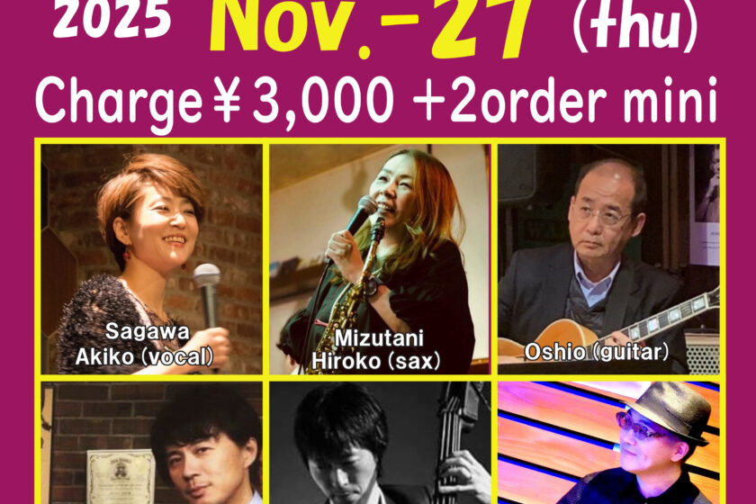 Jazz Live 11月 27 Thu 2025 難波 / Bigsalt845 メンバー 佐川明子(vo)、水谷浩子(sax)、木下孝朗(p) Oshio(g)、家口直哉(b)、木村優一郎(ds) チャージ¥3000 + 2オーダー別途要 前のスケジュール 次のスケジュール