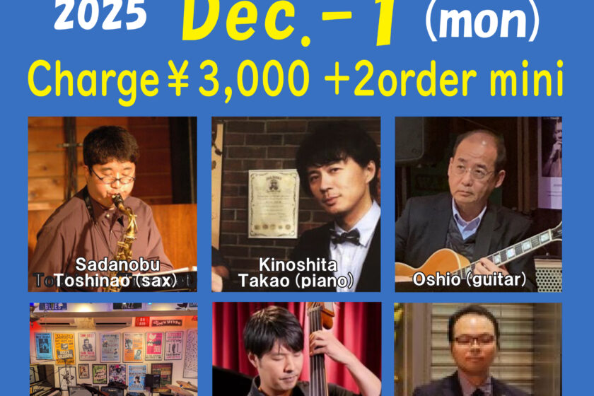 Jazz Live 12月 1 Mon 2025 難波 / Bigsalt845 メンバー 定延利尚(sax)、木下孝朗(pf)、Oshio(g) 西尾寛之(b)、伊波大輔(ds) チャージ¥3000+2オーダー別途要 前のスケジュール 次のスケジュール