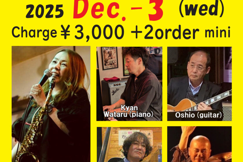 Jazz Live 12月 3 Wed 2025 難波 / Bigsalt845 メンバー 水谷浩子(sax&vo)、喜屋武弥(p)、Oshio(g) 芝田奨(b)、コウサカテルオ(ds) チャージ¥3000+2オーダー別途要 前のスケジュール 次のスケジュール