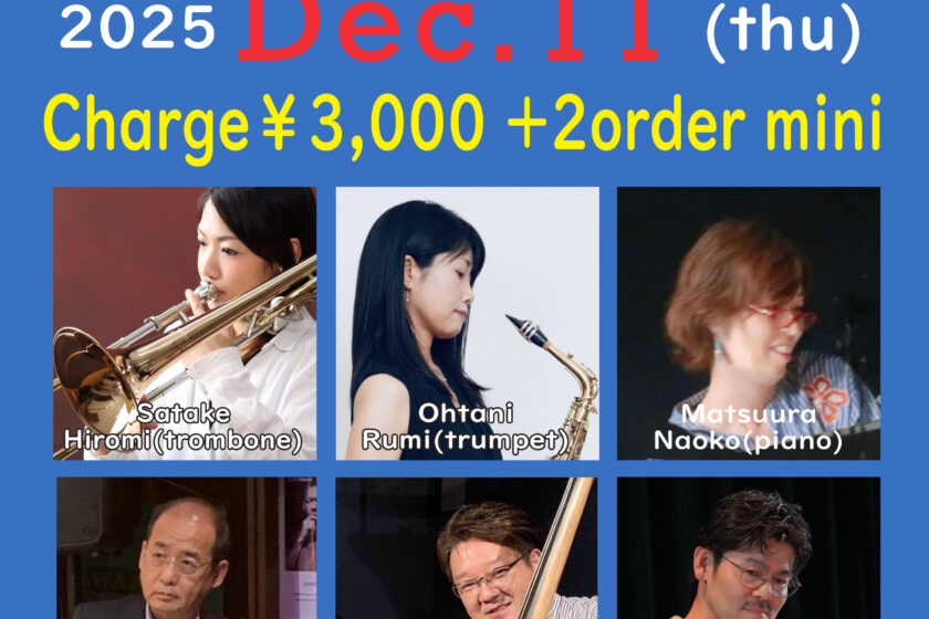 Jazz Live 12月 11 Thu 2025 難波 / Bigsalt845 メンバー 大谷瑠美(sax)、佐竹寛美(tb)、松浦尚子(p) Oshio(g)、加納真治(b)、奥瀬健介(ds) チャージ¥3000+2オーダー別途要 前のスケジュール 次のスケジュール